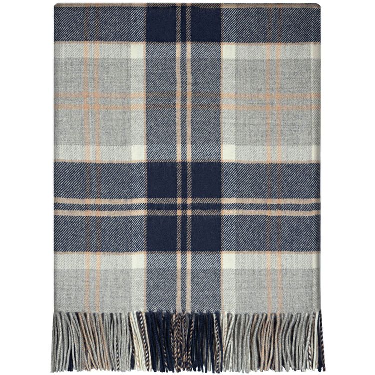 The Bannockbane Grey Lochcarron Lambswool Blanket is is grey and navy based tartan with a white and camel overcheck and is an ideal accessory to dress your home beautifully. Perfect for a cold winter's evening or alternatively, superb for use in the summer as a picnic rug. Made from 100% lambswool at our Selkirk mill the blanket combines traditional craftsmanship and quality. Why not inject a little Scottish personality into your interior style.