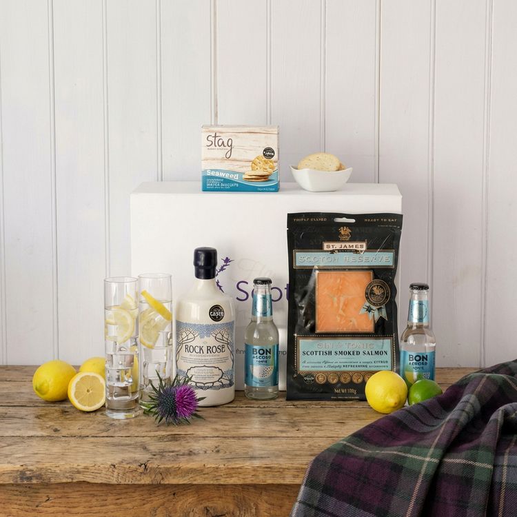 This delicious hamper also comes with two bottles of crisp tonic water, mouthwatering smoked salmon and delicate water biscuits flavoured with Hebridean seaweed. The perfect hamper for a romantic picnic or gift for a loved one.