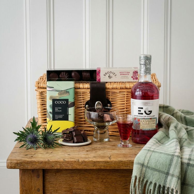 Who doesn't enjoy a glass of fruity gin accompanied by some scrumptious, creamy, tempting chocolates? Our Gin & Chocolate Hamper includes a selection of Scottish goodies that everybody will enjoy. This gift set includes a bottle of fine Edinburgh Gin Liqueur as well as two different delectable chocolates. Perfect for birthday gifts or as a small treat!