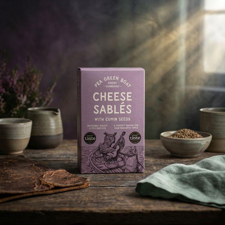 Leith-based Pea Green Boat make these luxury cheese sablés to an exacting recipe using locally-sourced Mungoswells organic wheat flour, rich golden butter, and lots and lots of cheese! With the warmth of cumin to contrast with your choice of cheese., delicious served as they are or warmed in the oven.